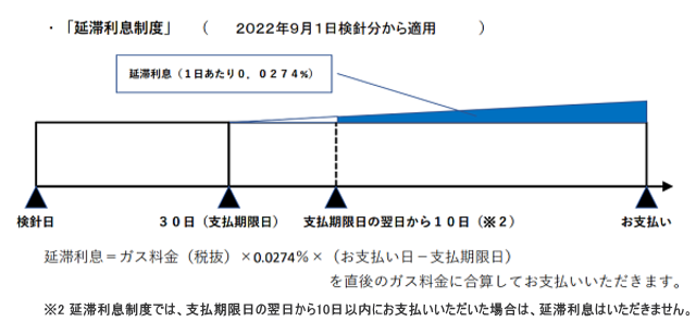 お客さまがガス料金を「支払期限日」を経過してお支払いいただいた場合に、その経過日数に応じて、対象となるガス料金(税別)に対して、1日当たり0.0274%の率で算定した延滞利息をいただく制度です。 延滞利息は、お支払いいただいた直後のガス料金とあわせてお支払いいただきます。 (ただし、支払期限日の翌日から10日以内にお支払いいただいた場合は、延滞利息はいただきません。)