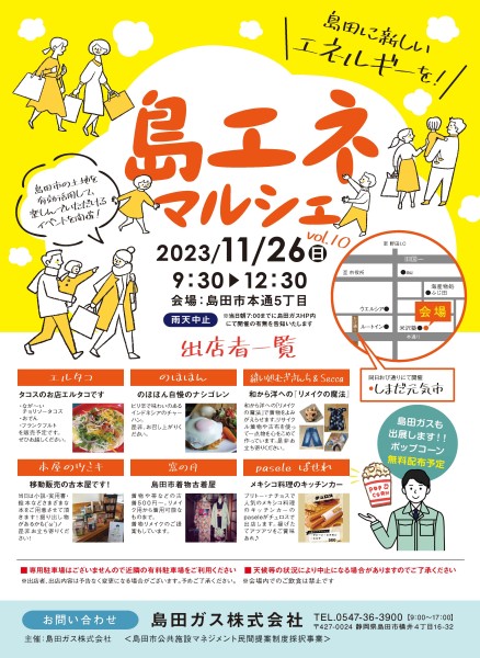 「島田市公共施設マネジメント民間提案制度事業」として2021年4月から開催しております「島エネマルシェ」の第10弾を11月26日(日)に本通5丁目で行います。